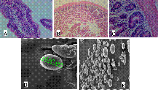 Estos resultados evidencian procesos inflamatorios en el grupo de tratamiento, dieta comercial sin aditivos (T0), en tanto los hallazgos observados en histología de su tejido intestinal como infiltración linfocitaria, enteritis necrótica, hiperplasia de células caliciformes y fusión de vellosidades, lo confirman, Figura 1D, 1E y 1C. Estas observaciones indican procesos inflamatorios acompañados de hiper producción de moco o mucinas que en su conjunto describen alteraciones patológicas en el tratamiento T0, Figura 1D, 1E y 1C; (Tabla 2).